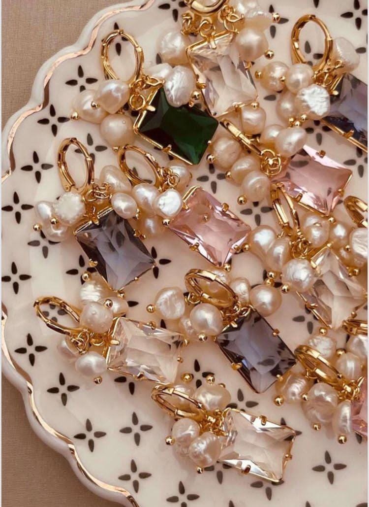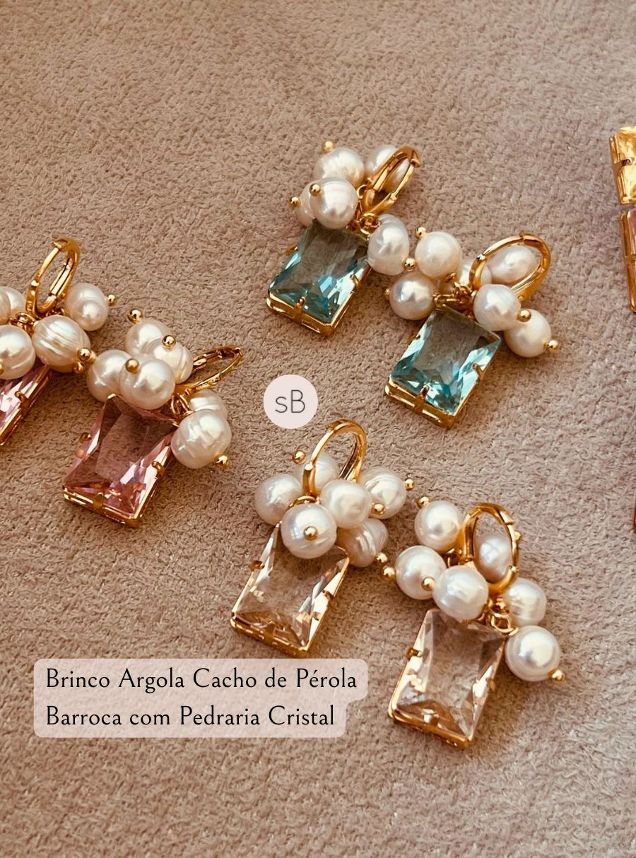 Brinco Argola Cacho de Pérola Barroca com Pedraria Cristal