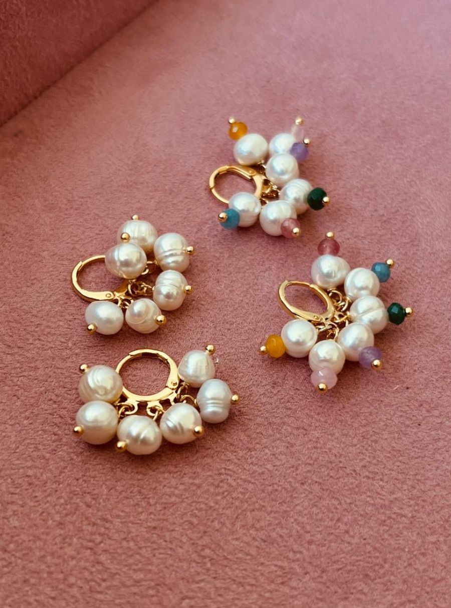 Brinco Cachinho de Pérolas com Jades Rainbow