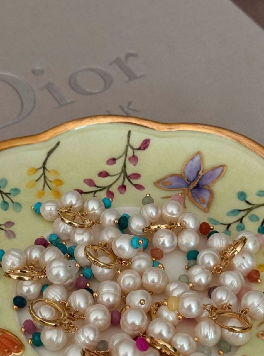 Brinco Cachinho de Pérolas com Jades Rainbow.