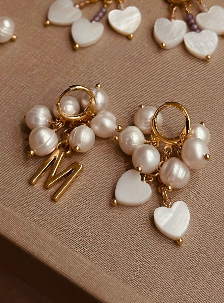 Brincos Cacho de Pérolas com Pingentes em Madrepérola e Inicial