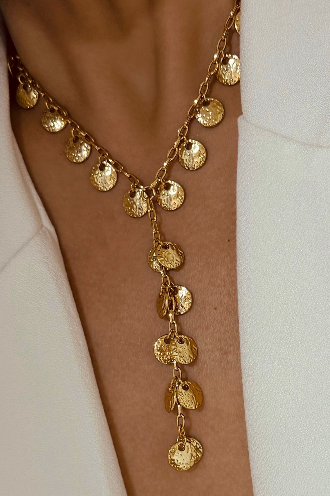 Colar estilo gravata com medalhas redondas marteladas | banho ouro