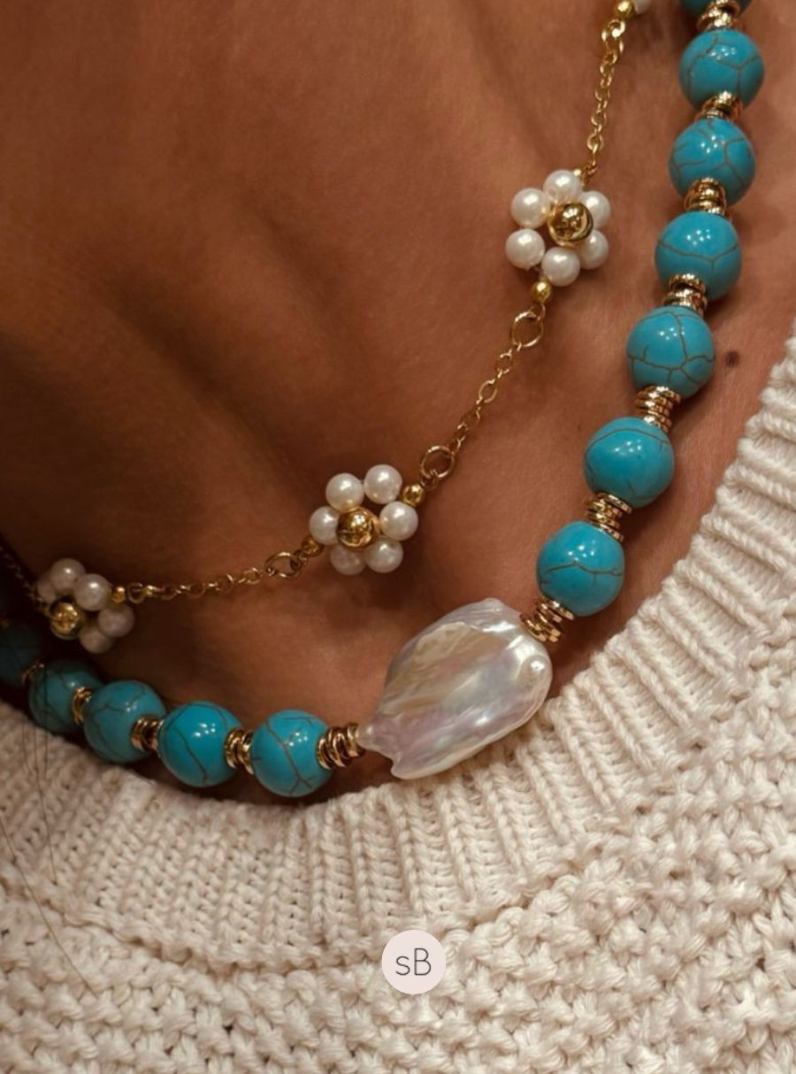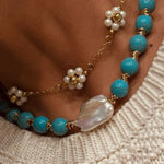 GARGANTILHA PEDRARIA NATURAL TURQUESA COM PÉROLA BARROCA GG R$305