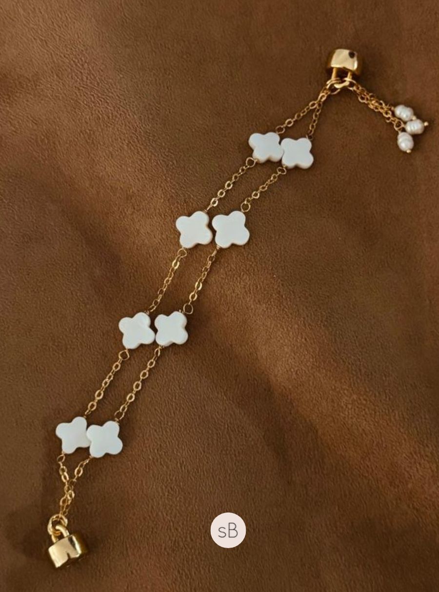 PULSEIRA FIO DUPLO COM CORRENTE FININHA E TREVO MADREPÉROLA