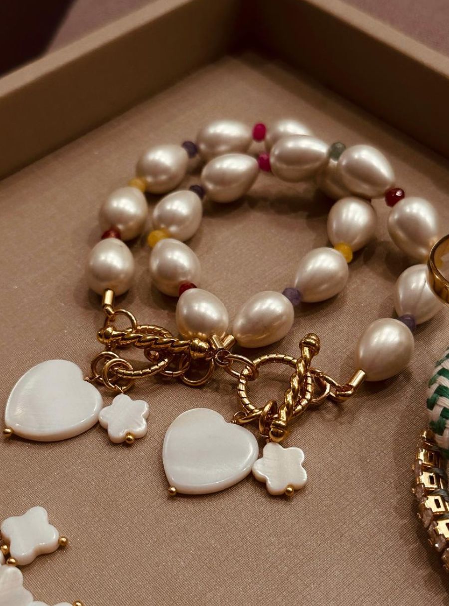 Pulseira Pérola Gota com Jades Rainbow e Pingentes madrepérola