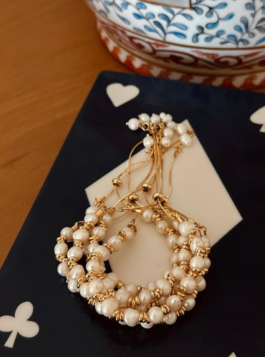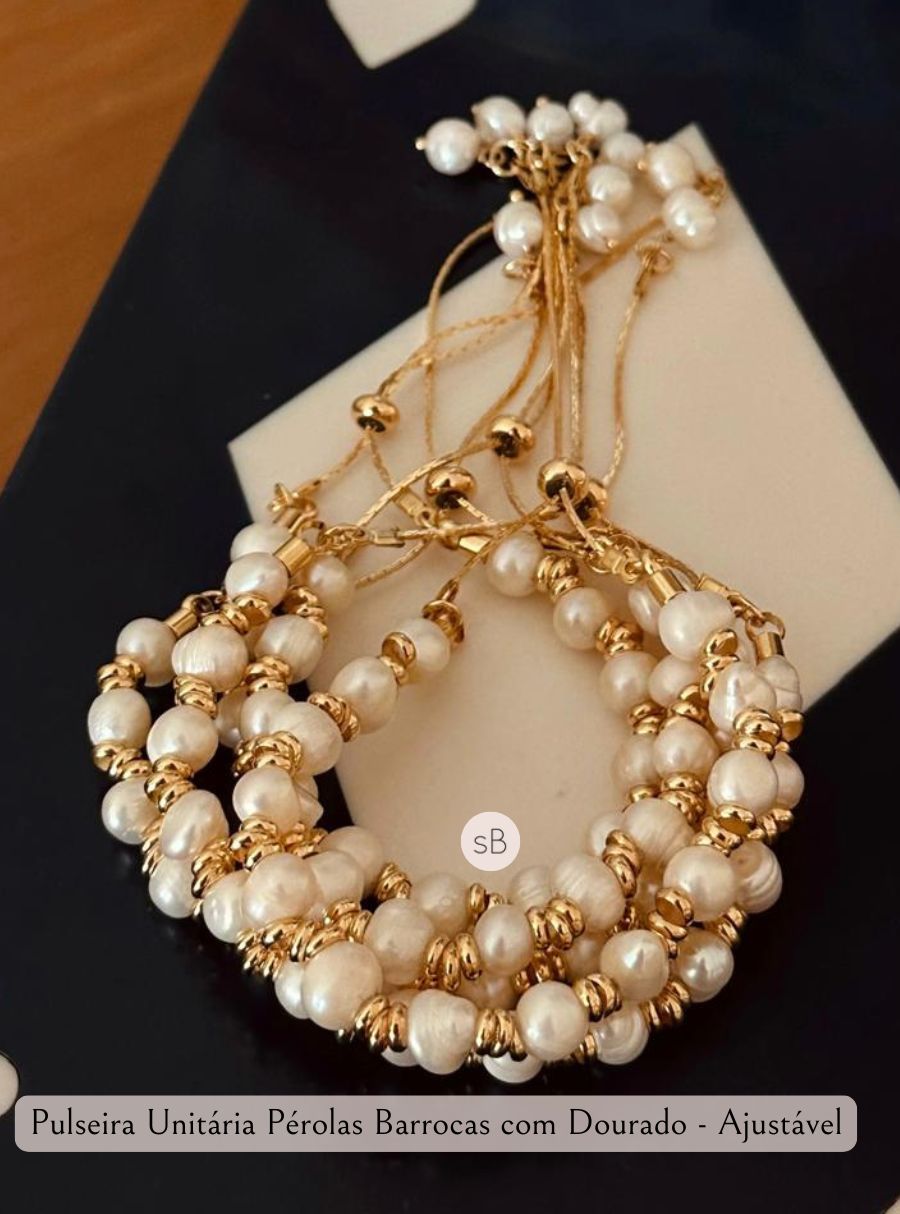 Pulseira Unitária Pérolas Barrocas com Dourado - Ajustável